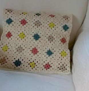 I've just finished joining these granny squares together for a cushion front and loving the little pops of colour! Used up some yarn from my stash in some favourite colours so it was an economical and guilt-free project. The next project is already on the go, but I mustn't neglect to actually finish this by putting a back on it or it'll end up in the ever growing pile of unfinished projects!